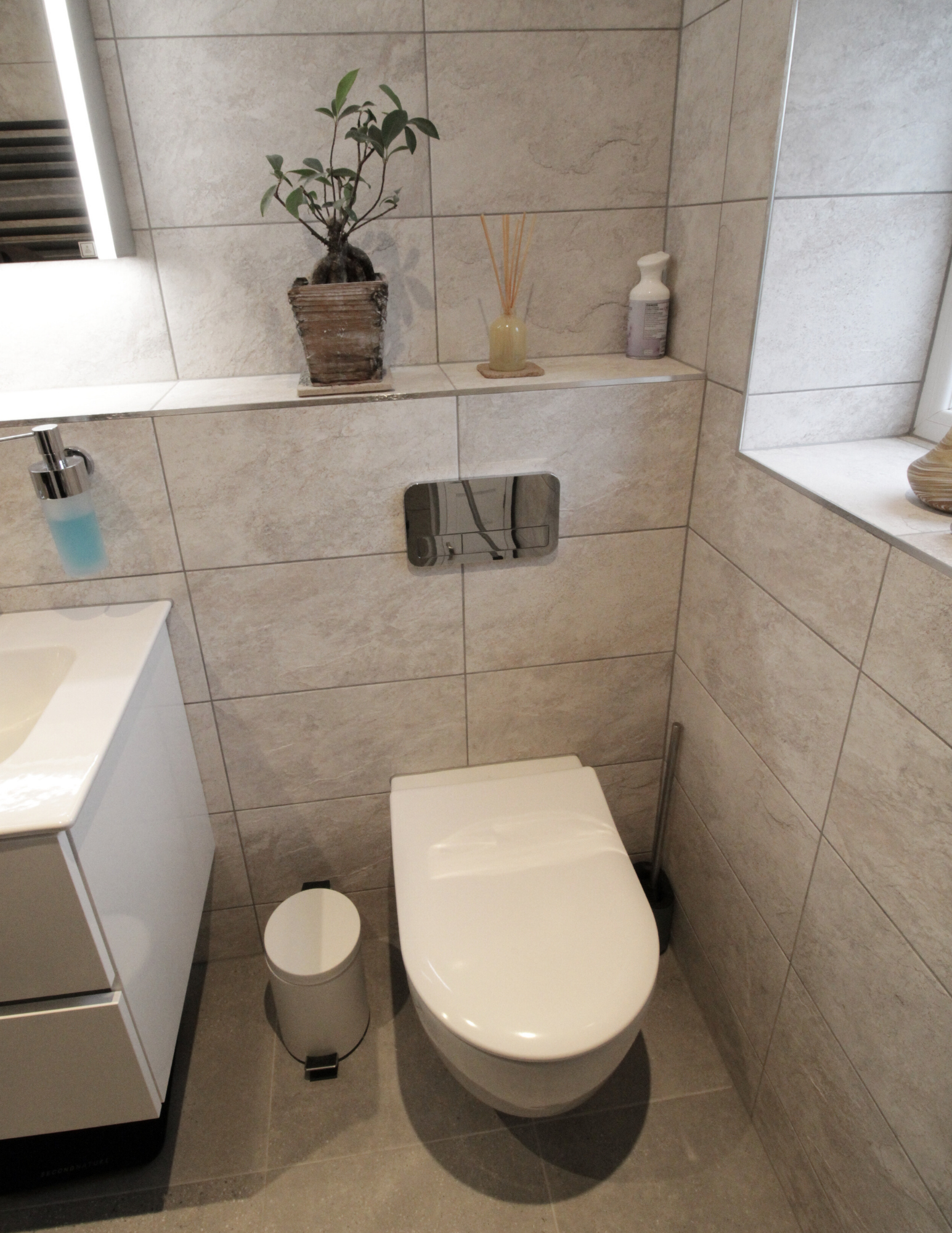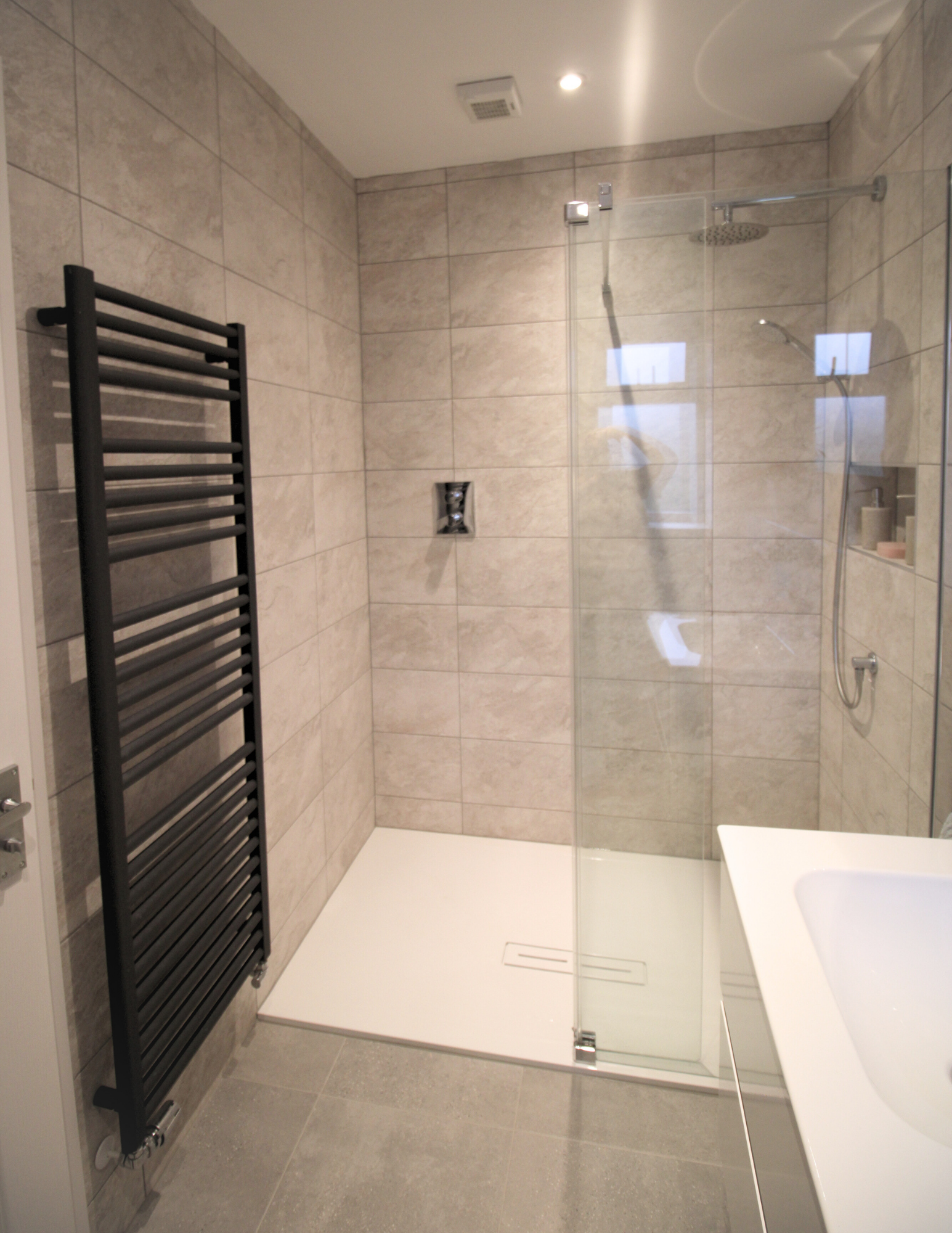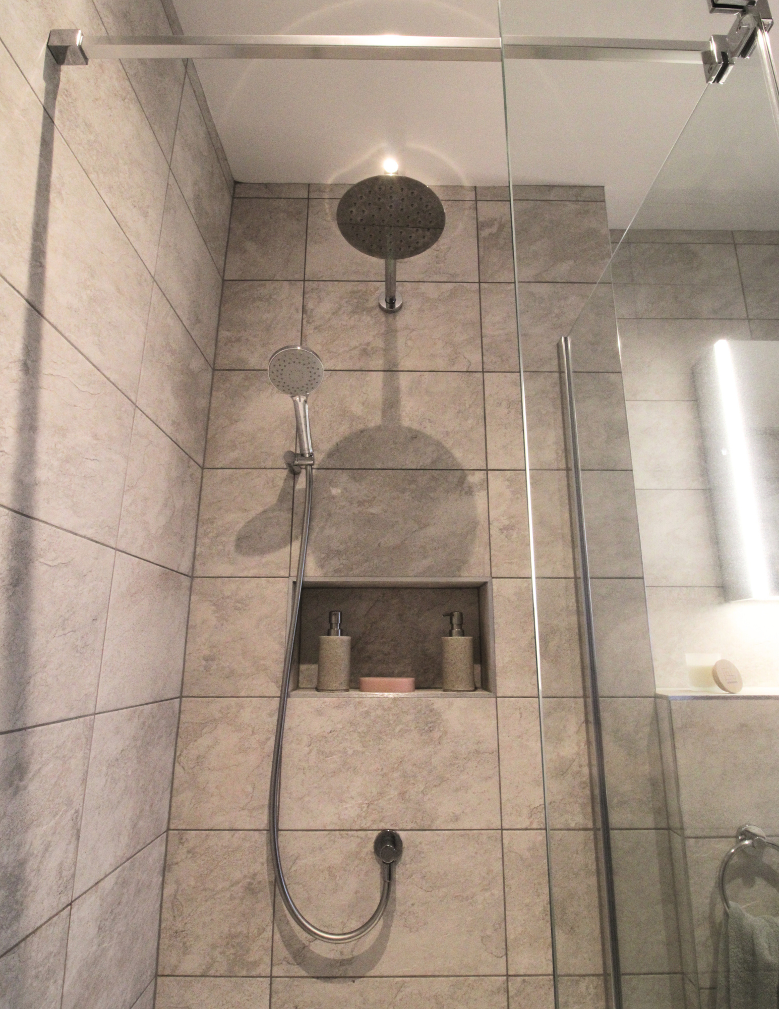 Comfort drove every design decision. We installed underfloor heating beneath the tiled floor and paired it with an anthracite heated towel rail to keep the room warm and welcoming. Wall-hung sanitaryware enhances the sense of space while making cleaning easier, and the generous walk-in shower (with both fixed and handheld outlets) makes daily showering feel luxurious.