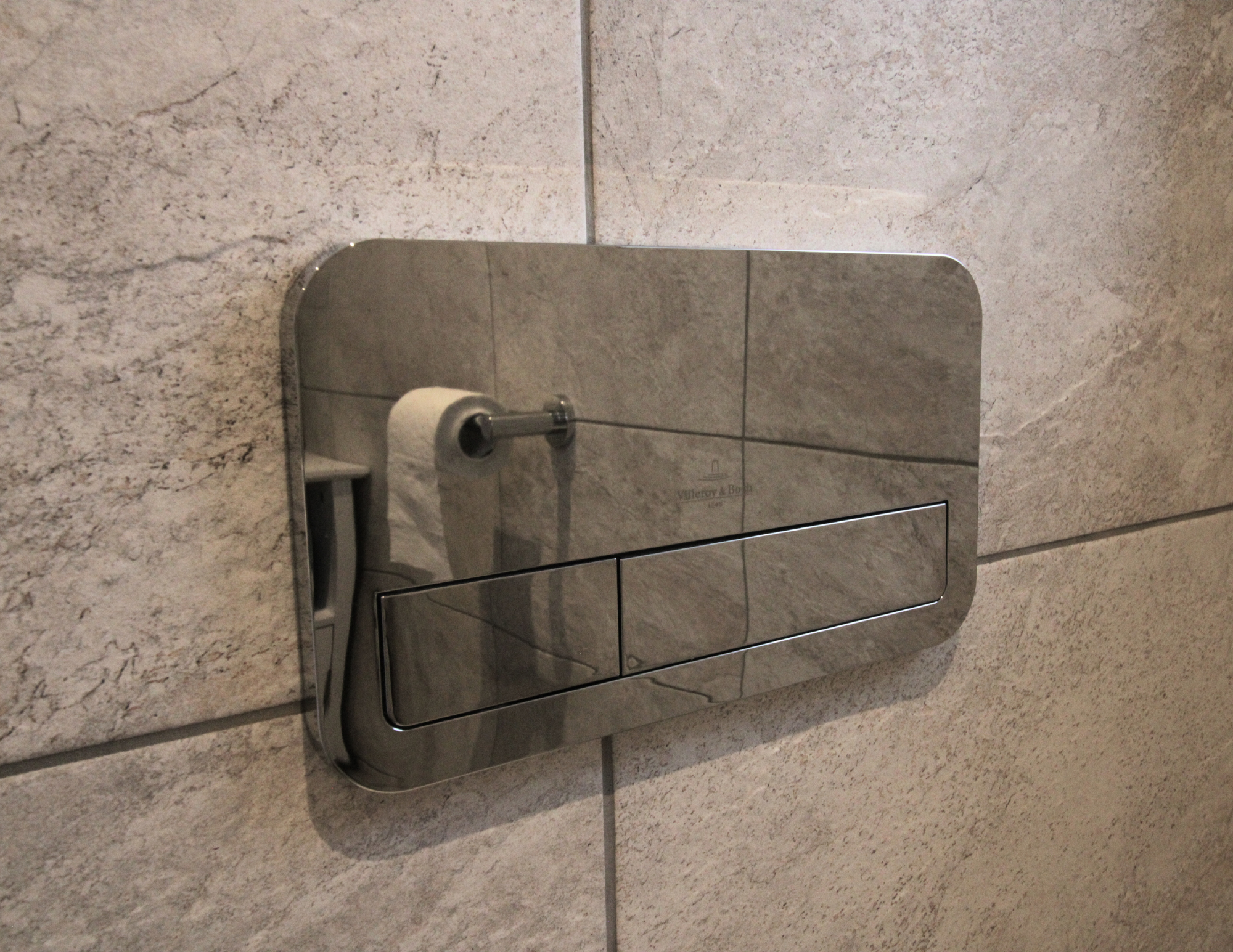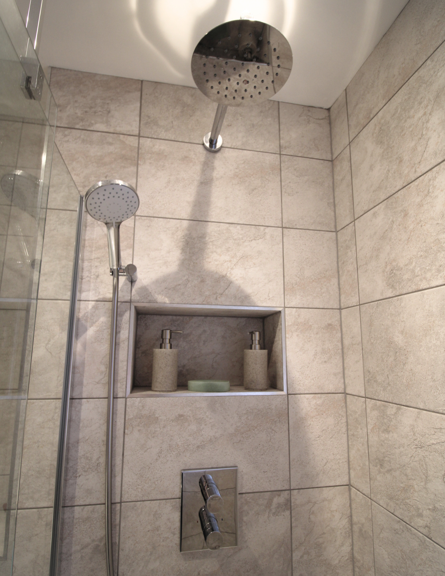By using the same Porcelanosa wall and floor tiles in both spaces, we created visual continuity between the existing home and the extension. Chrome fixtures, concealed shower controls, and carefully positioned lighting complete the look and enhance usability.