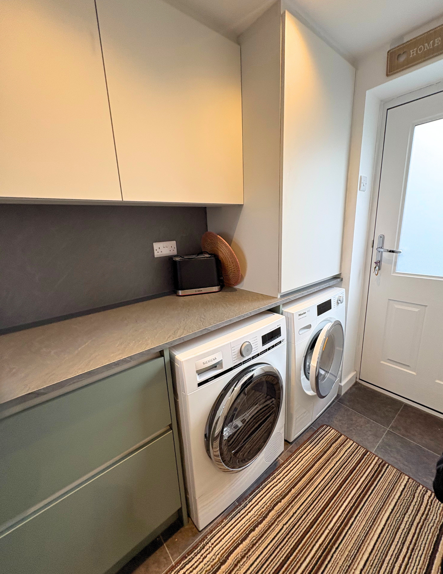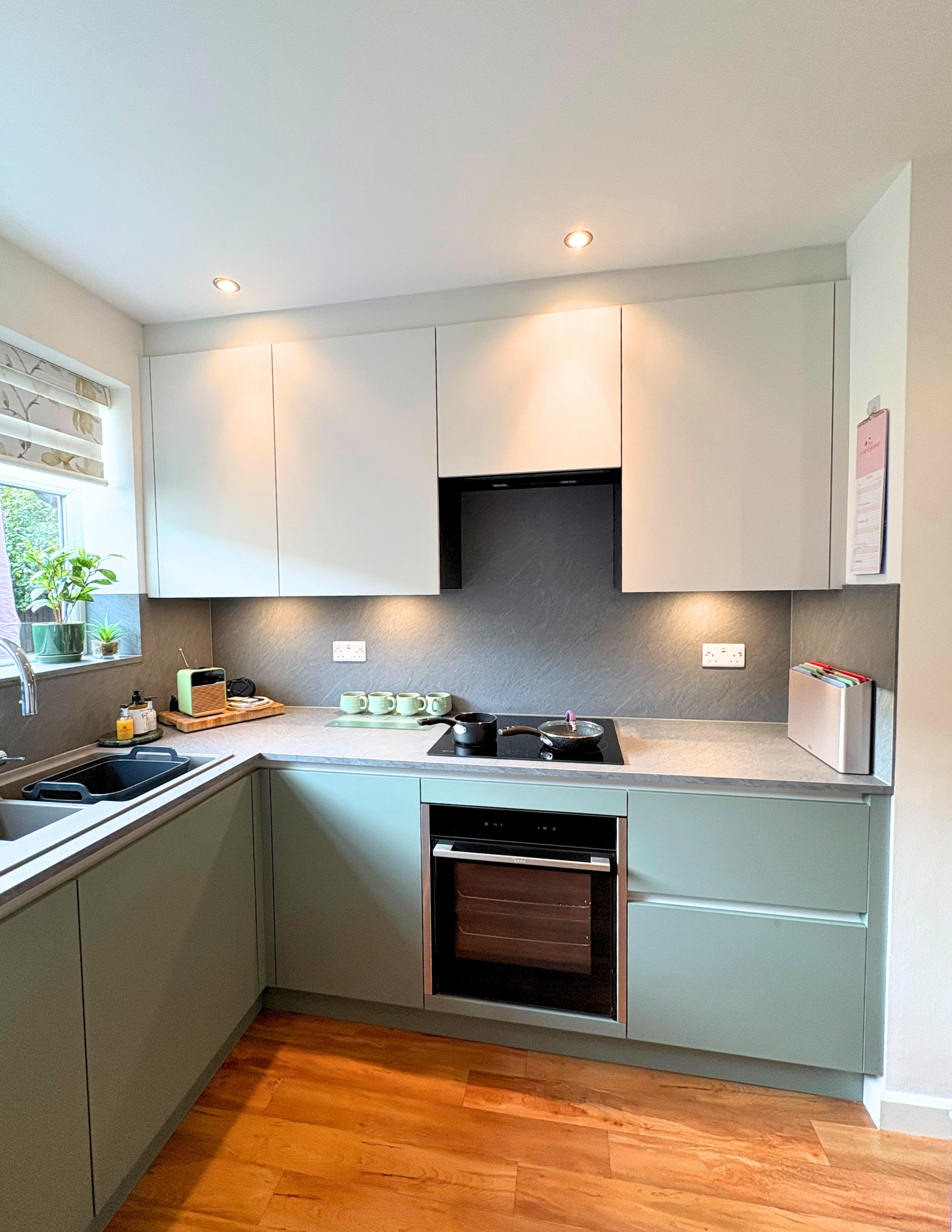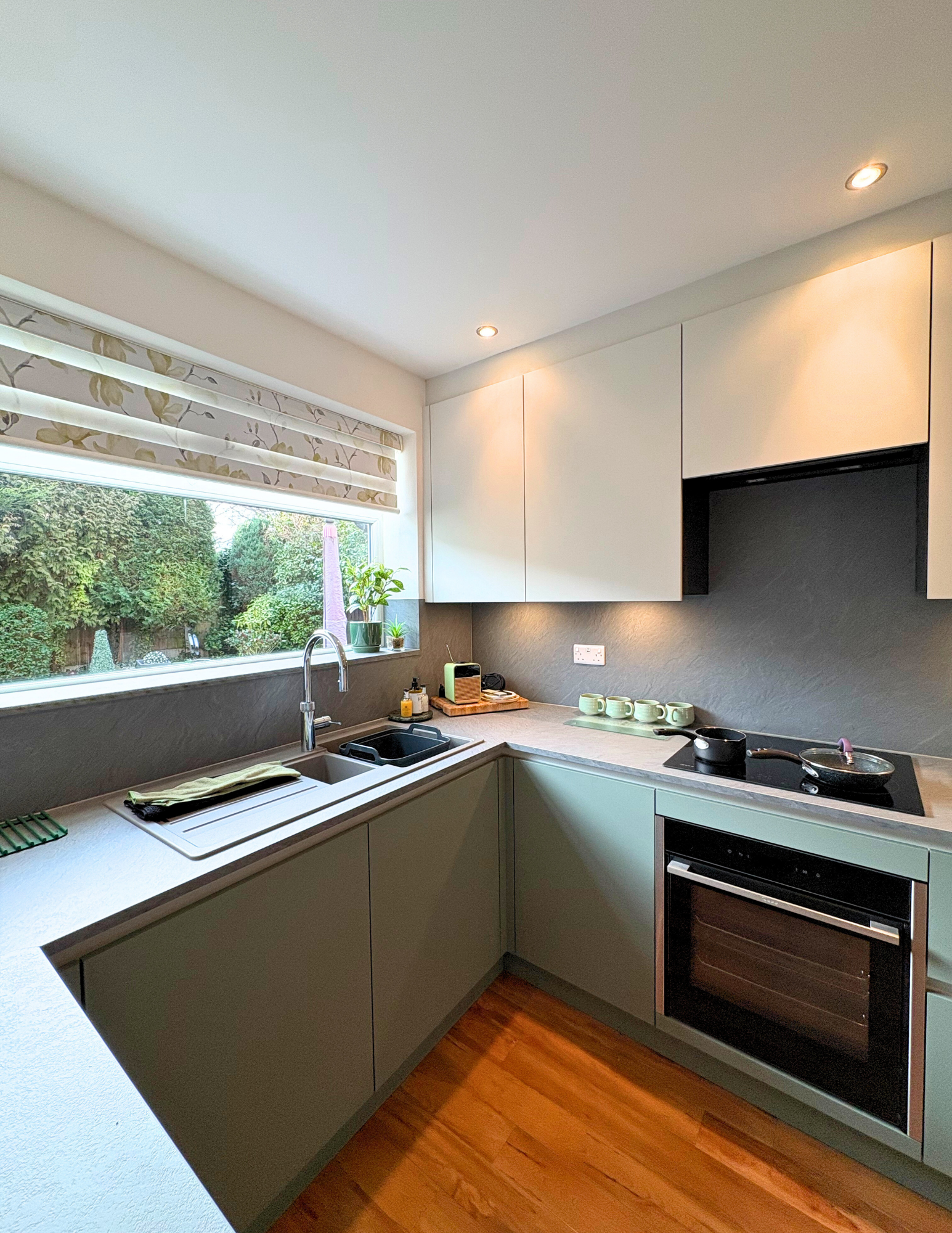 The laminate worktops, offer a durable and cohesive surface that works seamlessly with the cabinetry. Matching splashbacks and a coordinated windowsill help tie the whole scheme together, creating a clean, continuous finish.