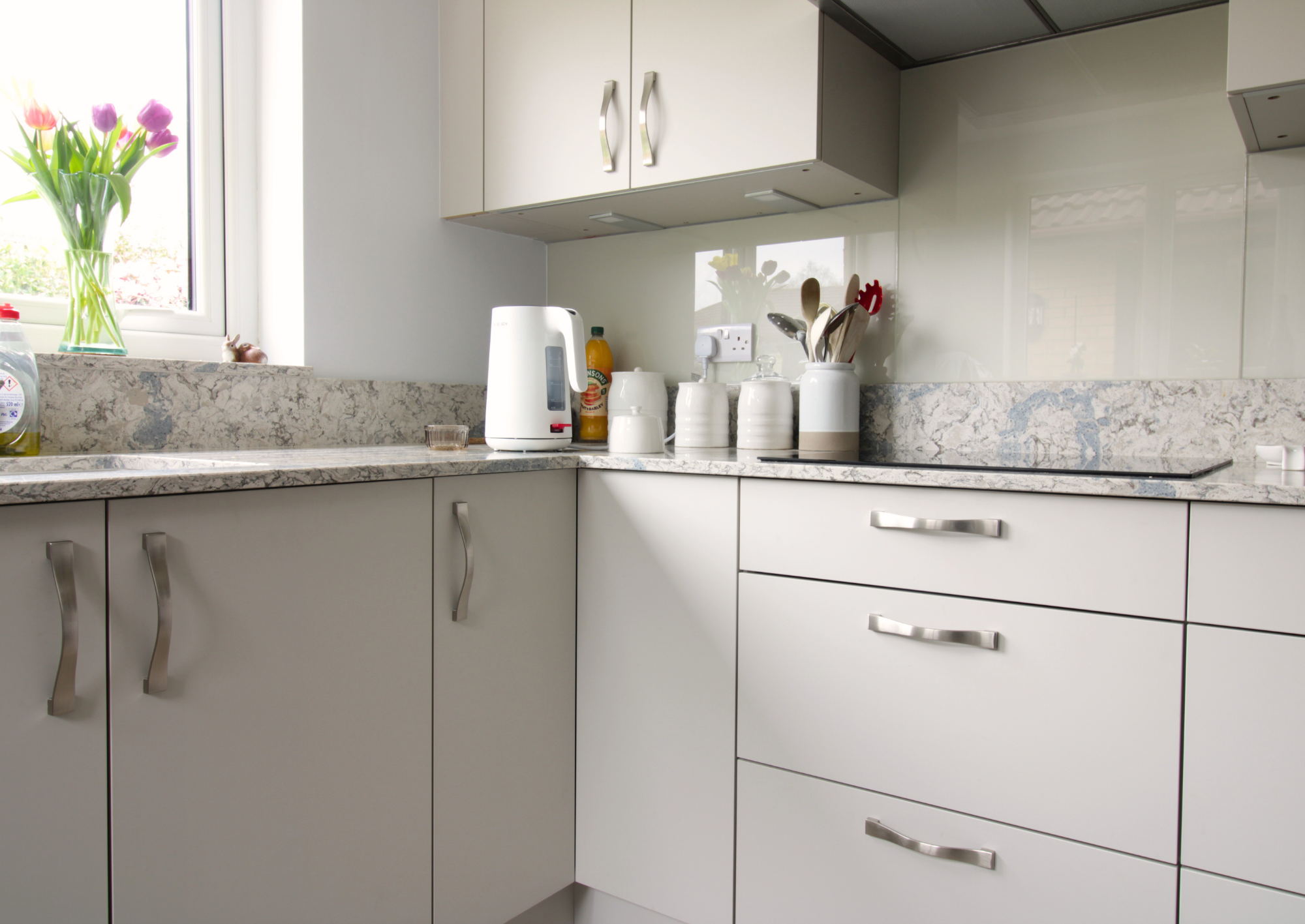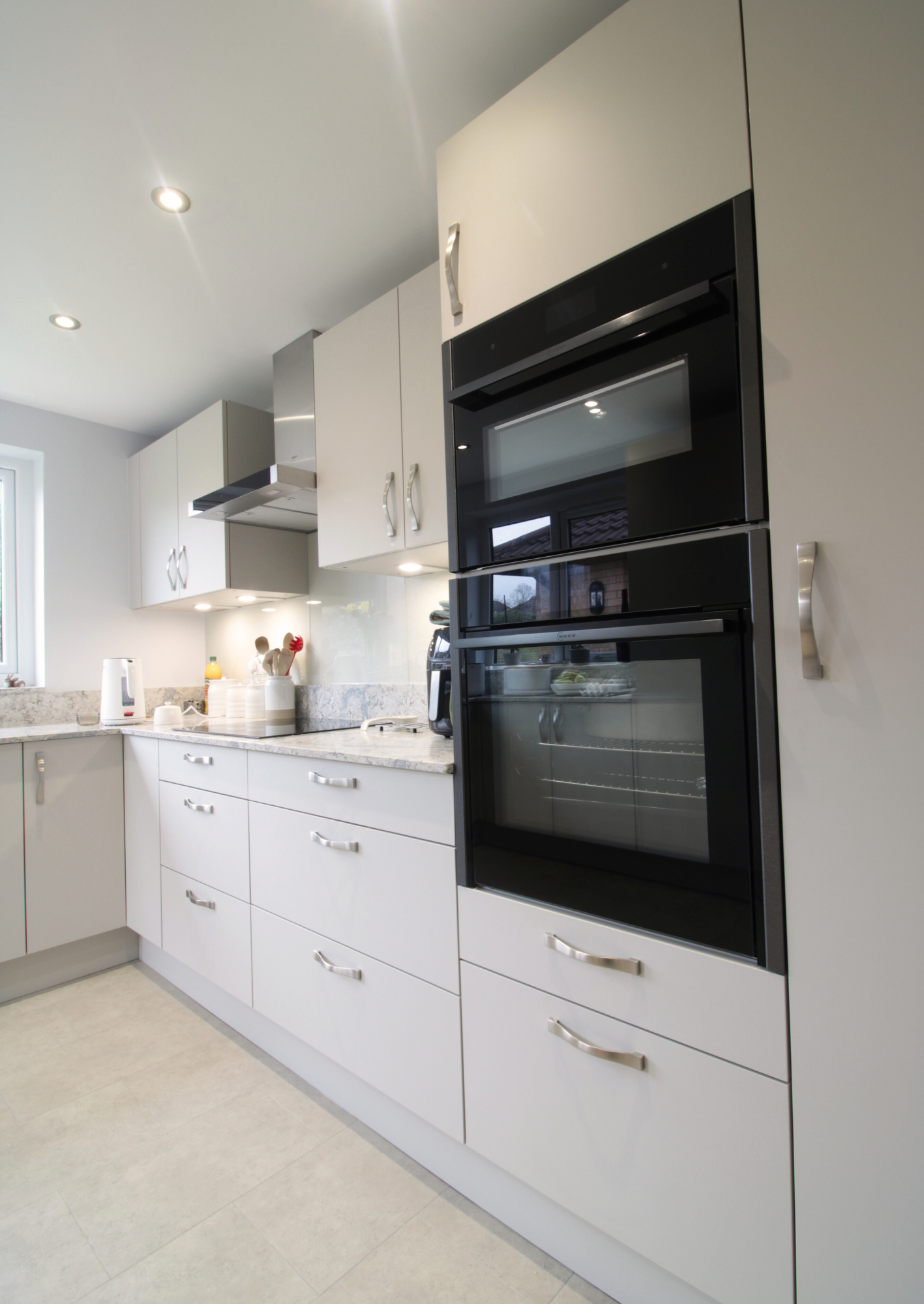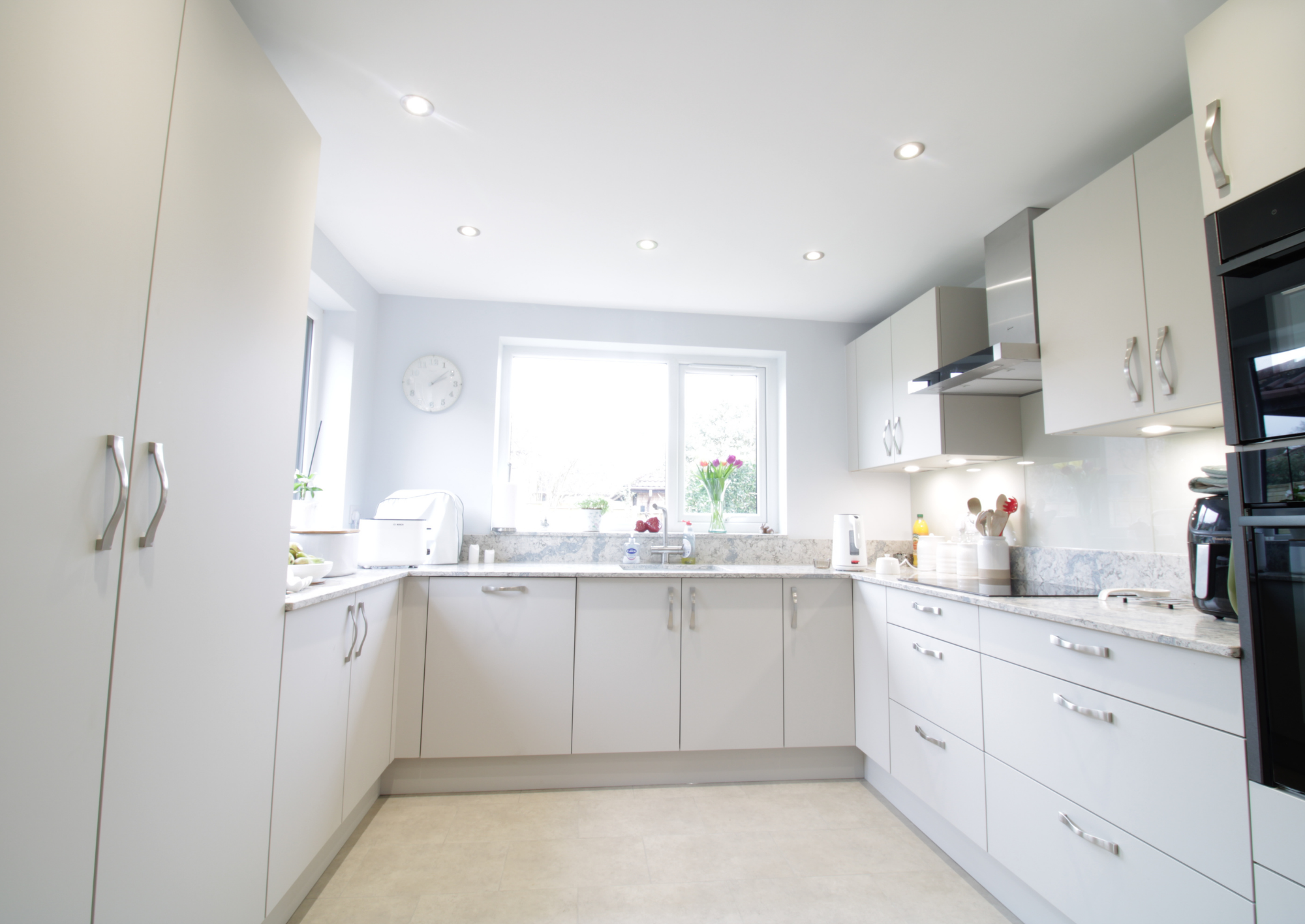 Mr and Mrs Lloyd chose the Masterclass Sutton Silk range in Highland Stone kitchen, a soft neutral colour that brings warmth and a contemporary feel to the space. In a soft grey, it keeps the newly brightened space feeling light and airy. Tall storage units and wide drawer bases provide generous storage while maintaining clean, uncluttered lines throughout the room. Integrated appliances from Neff help the kitchen feel streamlined, while quartz worktops in beautiful Amazonia add a durable, high-quality finish.