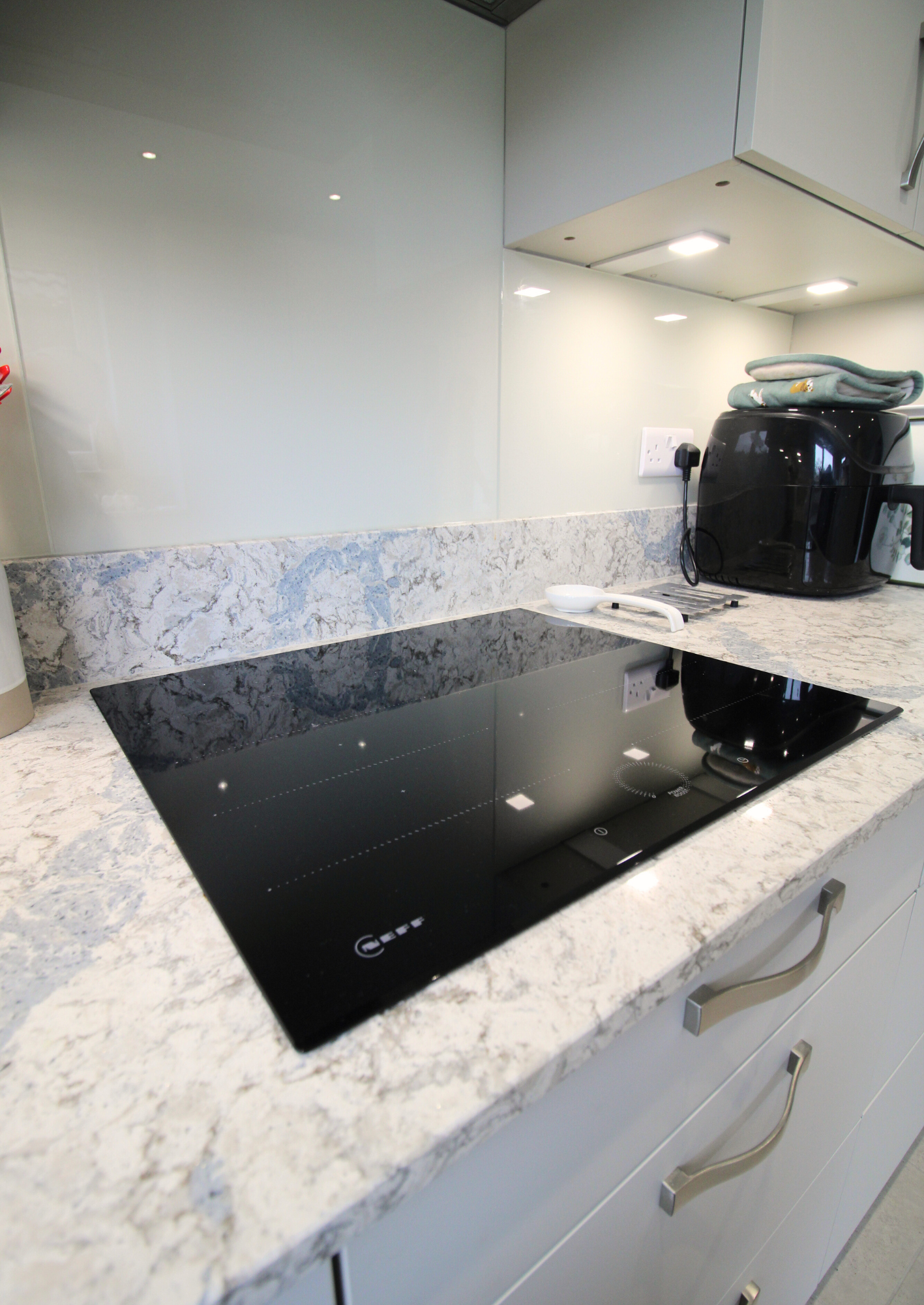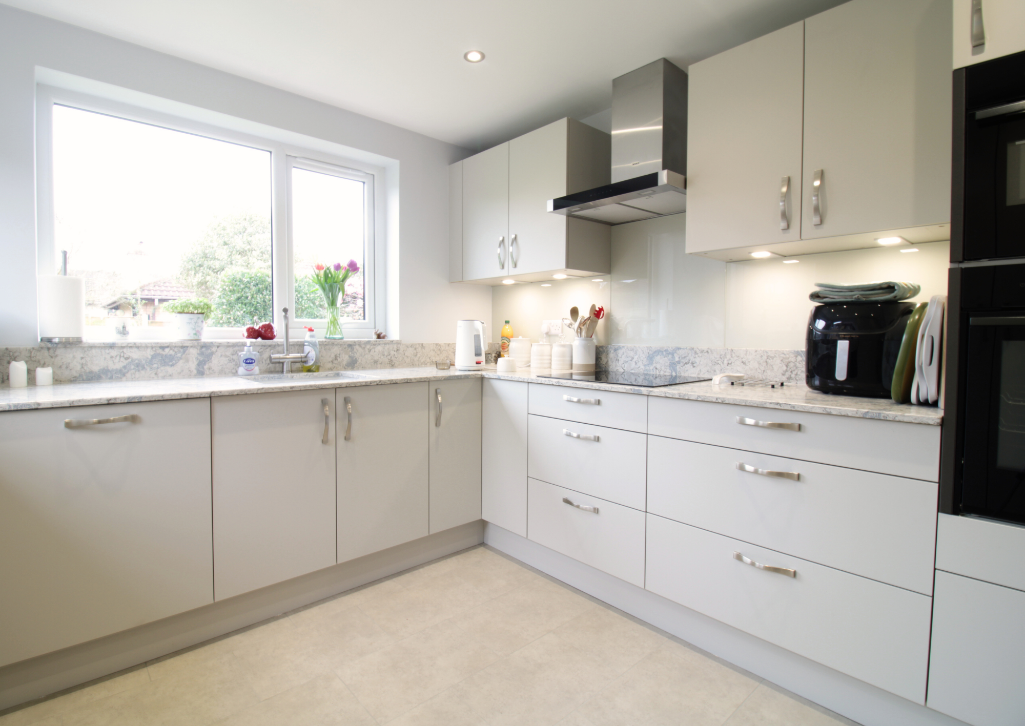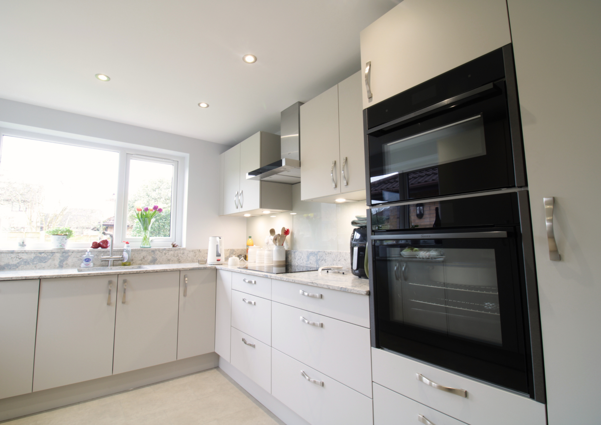 Mr and Mrs Lloyd chose the Masterclass Sutton Silk range in Highland Stone kitchen, a soft neutral colour that brings warmth and a contemporary feel to the space. In a soft grey, it keeps the newly brightened space feeling light and airy. Tall storage units and wide drawer bases provide generous storage while maintaining clean, uncluttered lines throughout the room. Integrated appliances from Neff help the kitchen feel streamlined, while quartz worktops in beautiful Amazonia add a durable, high-quality finish.